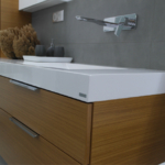Przebudowa istniejącej dużej łazienki, wiązała się z zaprojektowaniem nowego pomieszczenia kąpielowego wyposażonego praktycznie we wszystkie możliwe urządzenia. Szarość gresu na ścianach i podłodze koresponduje z ciepłym miodowym kolorem forniru na frontach mebli. Minimalistyczne i eleganckie w formie urządzenia łazienkowe oraz dopracowane detale mebli, nabierają zupełnie innego kształtu przy zmianie rodzaju oświetlenia z punktowego na rozproszone liniowe.