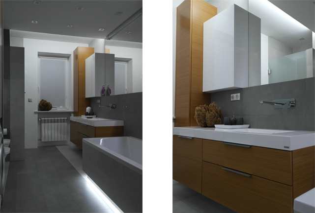Przebudowa istniejącej dużej łazienki, wiązała się z zaprojektowaniem nowego pomieszczenia kąpielowego wyposażonego praktycznie we wszystkie możliwe urządzenia. Szarość gresu na ścianach i podłodze koresponduje z ciepłym miodowym kolorem forniru na frontach mebli. Minimalistyczne i eleganckie w formie urządzenia łazienkowe oraz dopracowane detale mebli, nabierają zupełnie innego kształtu przy zmianie rodzaju oświetlenia z punktowego na rozproszone liniowe.