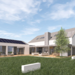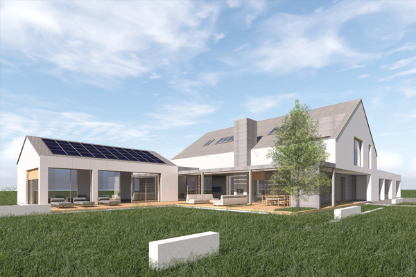 W podwarszawskiej miejscowości zaprojektowano nowoczesną rezydencję z wewnętrznym basenem. Minimalistyczna biała sylwetka budynku została podkreślona dużymi przeszkleniami, detalami elewacji oraz zadaszonym wielofunkcyjnym tarasem. Na parterze przewidziano przestronny salon z dwustronnym kominkiem oraz dwukondygnacyjną przestrzenią. Salon, jadalnia oraz kuchnia tworzą wspólną przenikającą się przestrzeń a wszystko doskonale doświetlone przez szerokie przeszklenia. Od strony północnej zaprojektowano odrębny aneks mieszkalny wraz z niezależnym wejściem. Basen znajduje się w zachodnim skrzydle budynku a funkcja ta zasilana będzie odrębnym systemem pompy ciepła oraz panelami fotowoltaicznymi. Podobnie część mieszkalna ogrzewana będzie za pomocą odnawialnych źródeł energii. Na piętrze znajdziemy sypialnie z łazienkami a w piwnicy salę rekreacyjną oraz pomieszczenia techniczna. Dla zagwarantowania wieloletniej trwałości, elewacje zostaną wykończone białymi płytami ze spieków kwarcowych a dachy szarą dachówką betonową. Całość zostanie przełamana drewnianym wykończeniem tarasu.